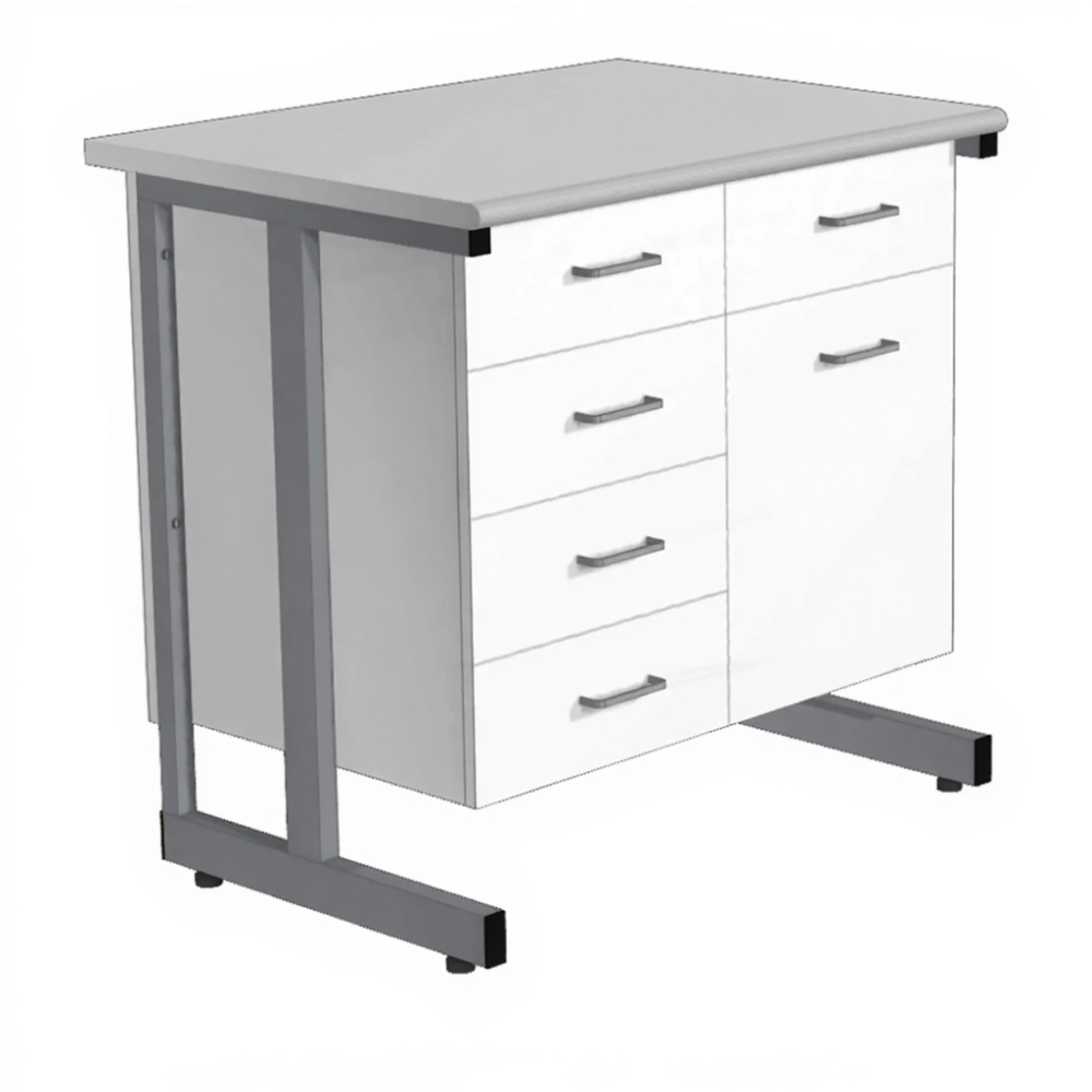 - Эргономичная система хранения — тумба из ЛДСП 16 мм с кромкой ПВХ включает левую секцию с 4 выдвижными ящиками на шариковых направляющих и правую секцию с верхним ящиком и дверкой с внутренней полкой. Возможно изготовление тумбы из металлического листа толщиной 1 мм.