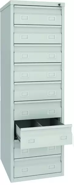 Шкаф картотечный FB-9 — это надежное и функциональное решение для хранения файлов и документов формата А6, а также трудовых книжек в подвесных файлах и папках. Модель оснащена усиленными телескопическими направляющими выдвижных ящиков и рассчитана на 9 ящиков.