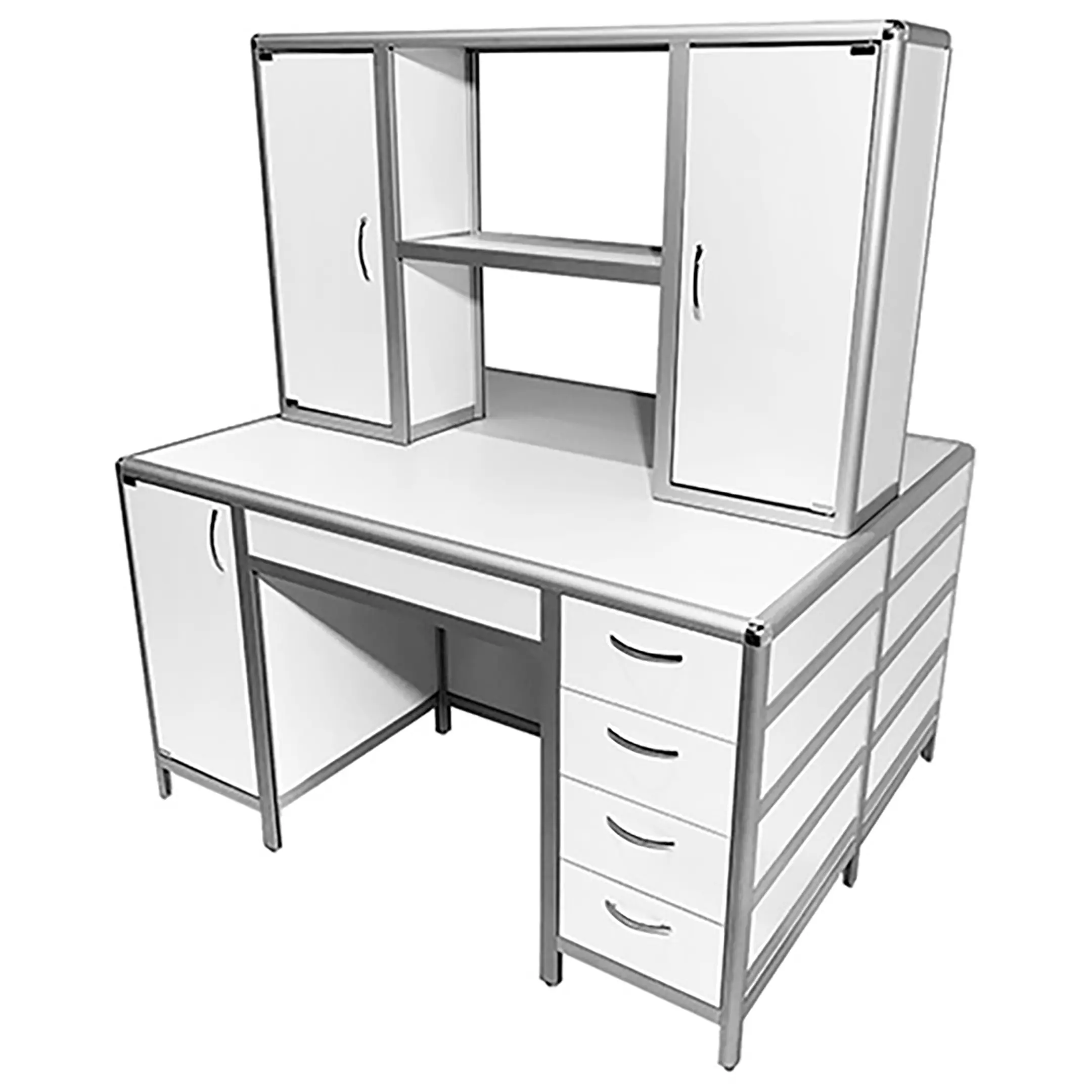 Стол лабораторный островной MED 11.004al с надстройкой (белый) — это идеальное решение для создания двух рабочих мест в лабораториях и медицинских учреждениях, обеспечивая оптимальное использование доступного пространства помещения. Модель оснащена двумя рабочими местами, каждое с двумя тумбами: одна с распашной дверкой и полкой, вторая с четырьмя выдвижными ящиками. Надстройка разделяет рабочее пространство на два сегмента. Каркас выполнен из алюминиевого профиля, столешница из ЛДСП толщиной 22 мм.