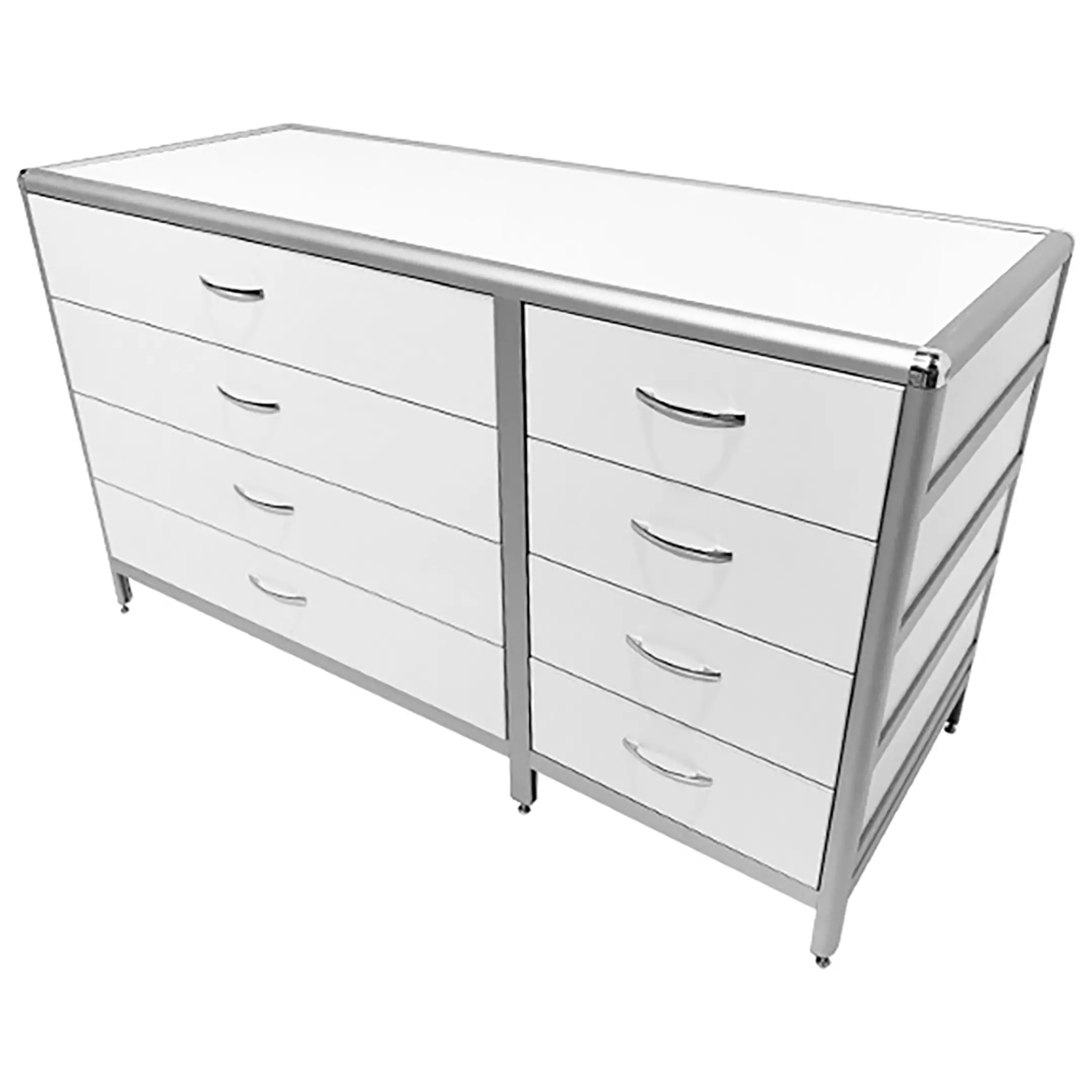 Стол-тумба лабораторная MED 12.016al (белый) — это функциональное решение для хранения лабораторного инвентаря, приборов и материалов в лабораториях и медицинских учреждениях. Модель разделена на два вертикальных отдела (большой и маленький), каждый из которых оснащен четырьмя выдвижными ящиками. Каркас выполнен из алюминиевого профиля, столешница из ЛДСП толщиной 16 мм.
