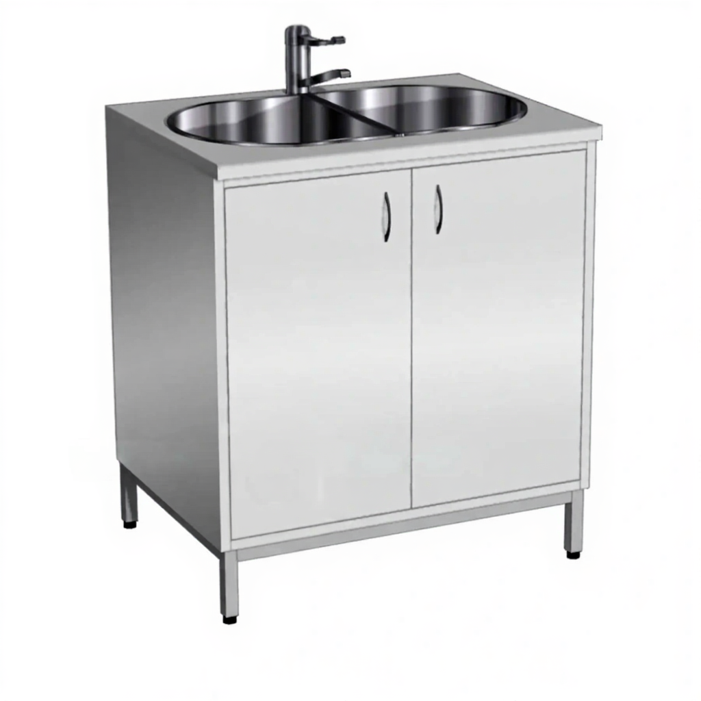 - Двухчашевая врезная мойка — из нержавеющей стали, комплектуется локтевым смесителем, обеспечивает удобство мытья посуды.