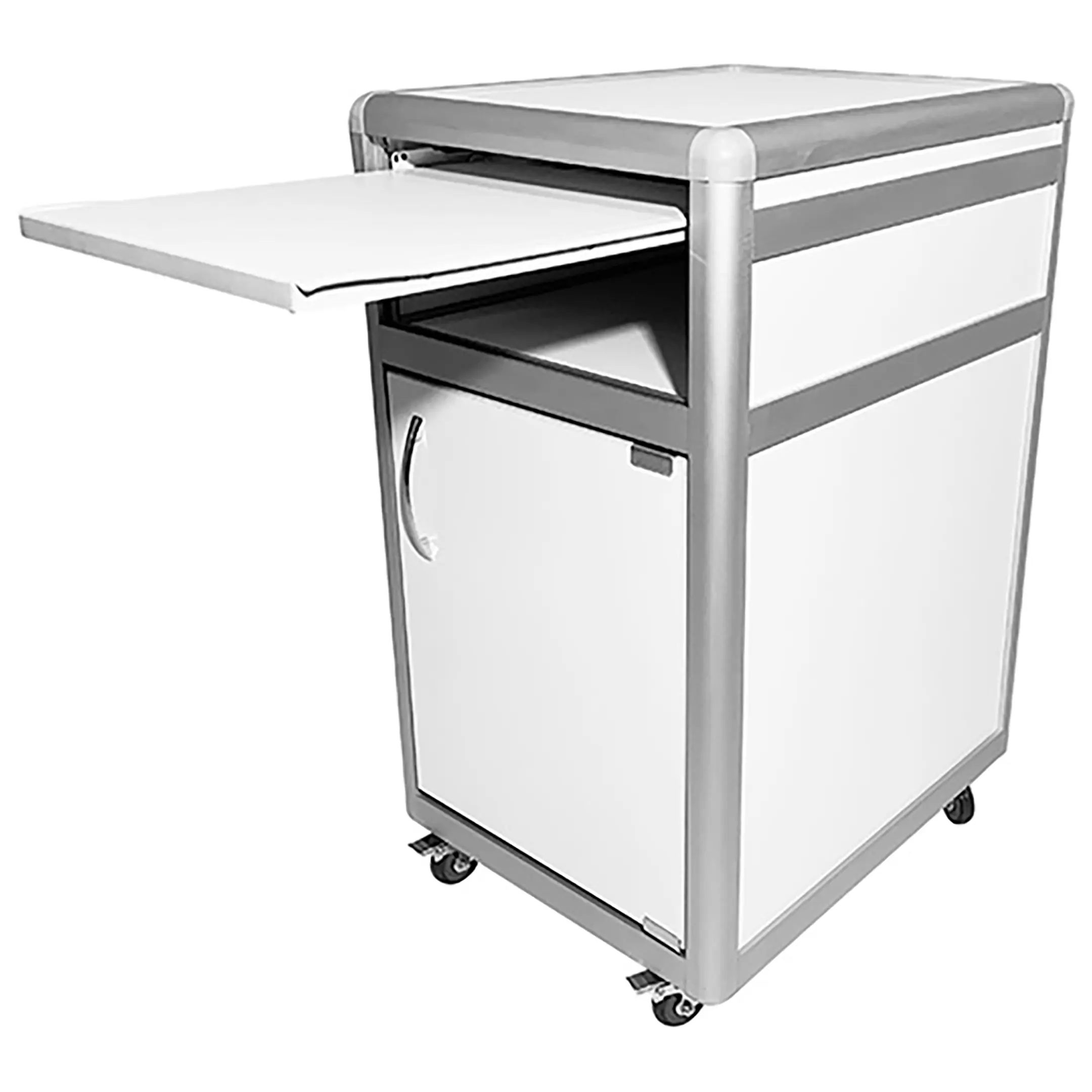 - Функциональная организация — выдвижная полка, открытая ниша и отделение с распашной дверкой и полкой для удобного хранения.