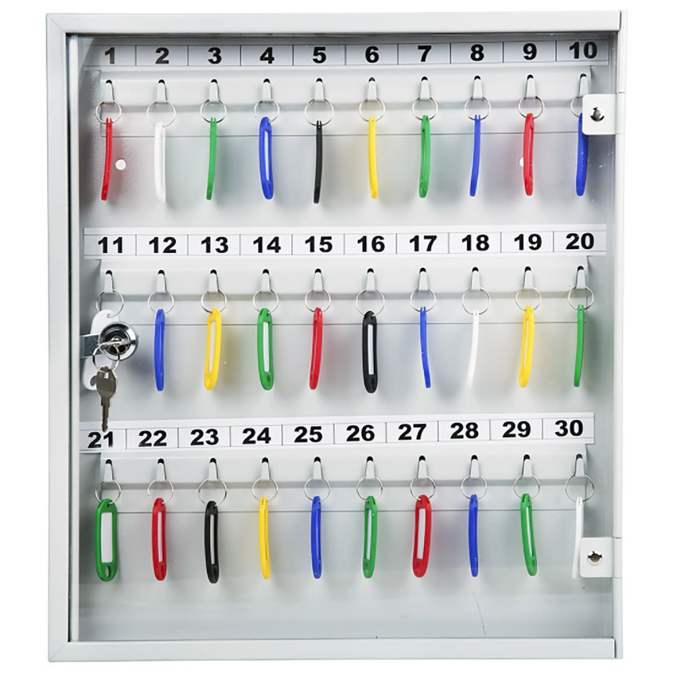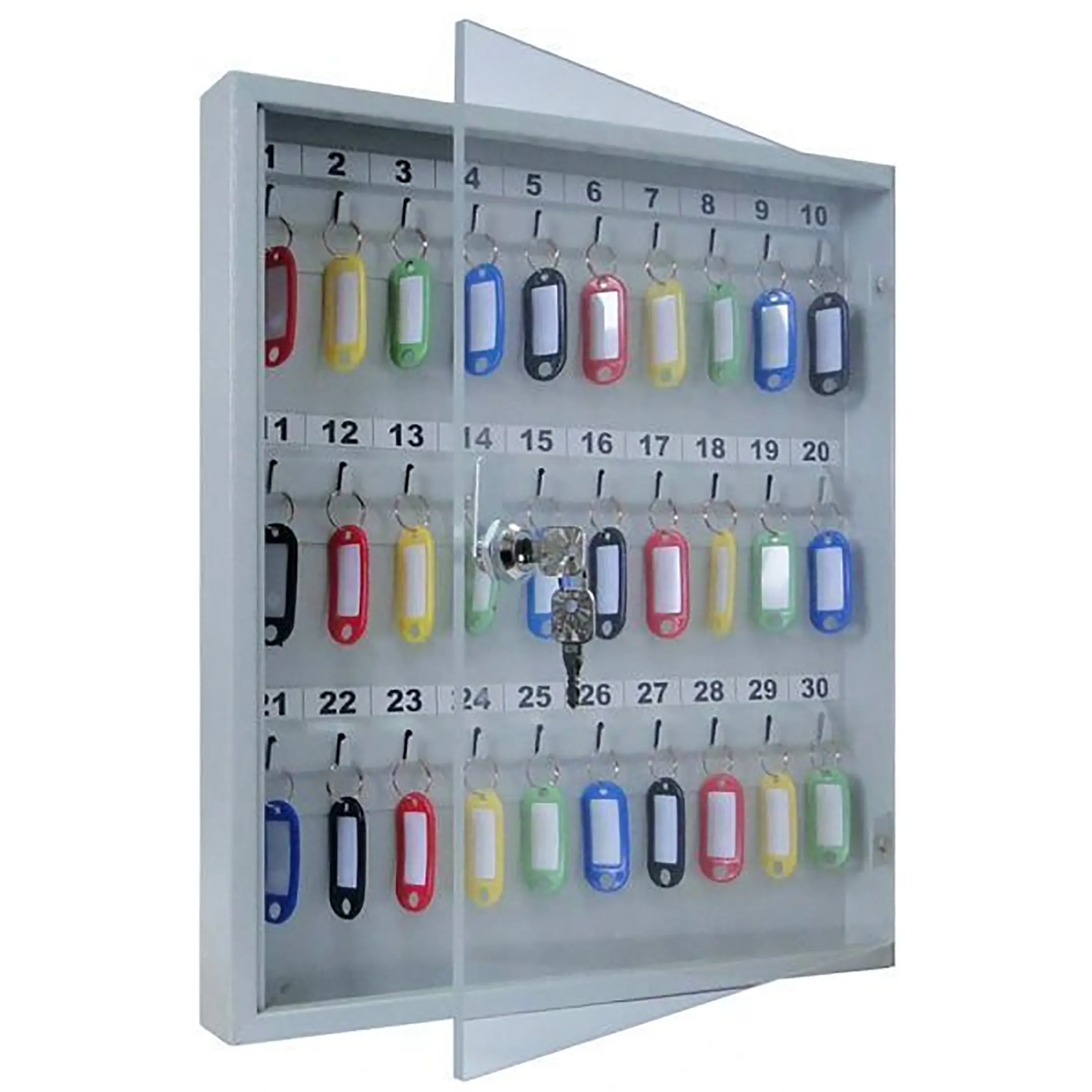 Ключница с прозрачной дверцей КЛС-30 (с брелками) — это практичная и наглядная система для организованного хранения ключей в учреждениях и на предприятиях. Конструкция со стеклянной дверцей и полным комплектом брелков обеспечивает удобный визуальный контроль, быстрый поиск и надежную защиту для 30 комплектов ключей.