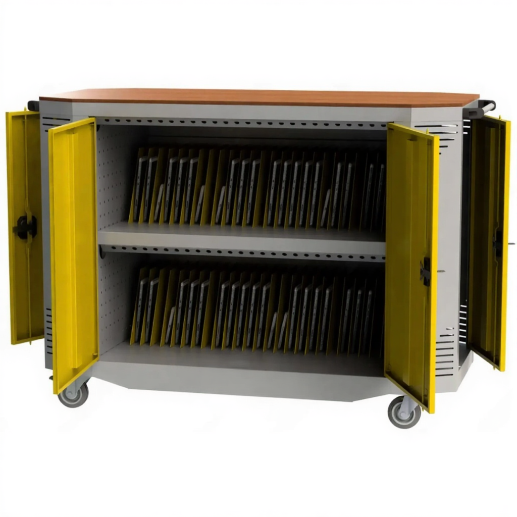Тележка для 52 планшетов с электросхемой — это высокотехнологичное и промышленное решение для организации масштабного мобильного компьютерного класса или центра выдачи устройств в крупных образовательных учреждениях, библиотеках или корпоративных учебных центрах. Модель представляет собой профессиональную тележку-сейф, рассчитанную на одновременное хранение, транспортировку и синхронную зарядку до 52 планшетов. Наличие встроенной электросхемы (интеллектуальной системы управления питанием) является ключевым элементом, обеспечивающим безопасную и эффективную работу всего парка устройств.