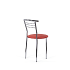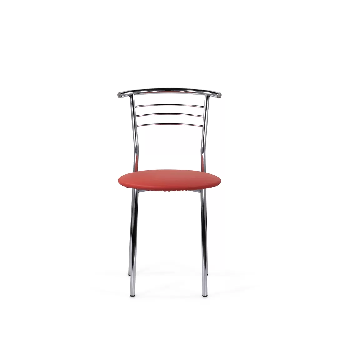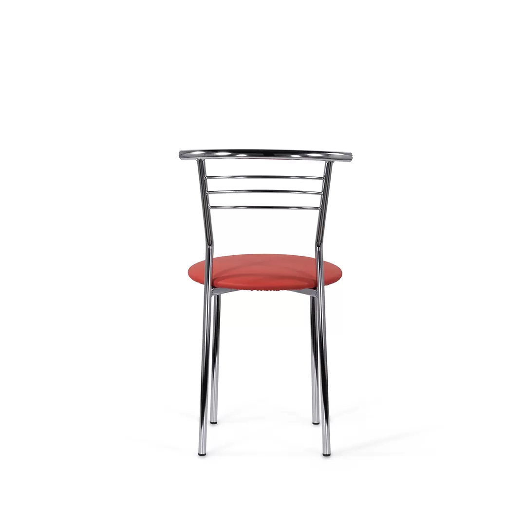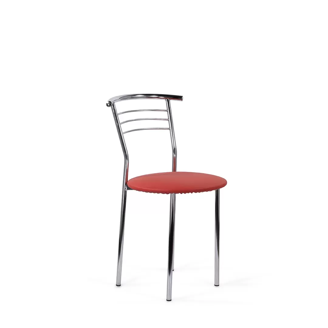 Стул с широким круглым сиденьем и удобной округлой хромированной спинкой. Простые, четкие линии силуэта и компактный размер стула хорошо смотрится на кухне, в столовой, в помещениях кафе.