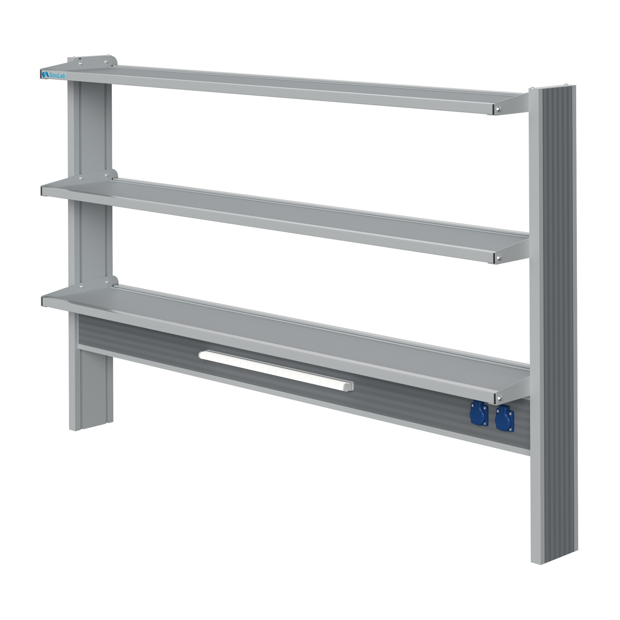 - Вместительная конструкция — три полки глубиной 300 мм в алюминиевых рамках позволяют разместить большое количество лабораторного инвентаря и оборудования.