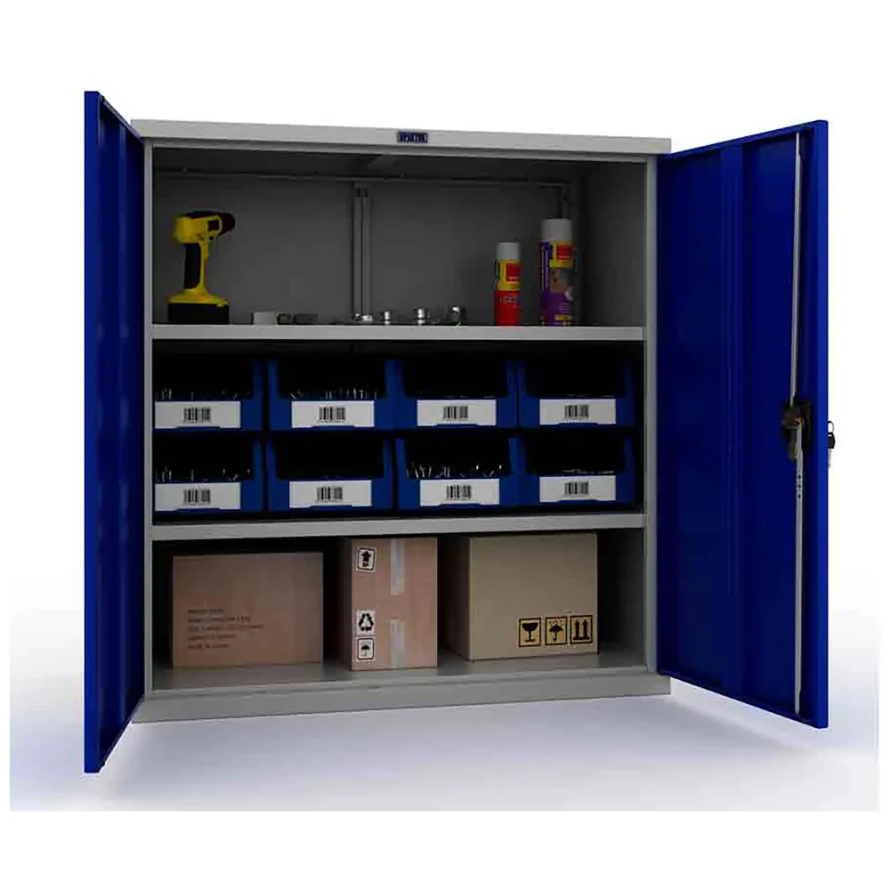 - Надежная защита содержимого — прочный стальной корпус и запирающиеся на замок двери обеспечивают защиту ценного инструмента от кражи, несанкционированного использования, а также от пыли и влаги в нерабочее время. Замок гарантирует базовый уровень безопасности.