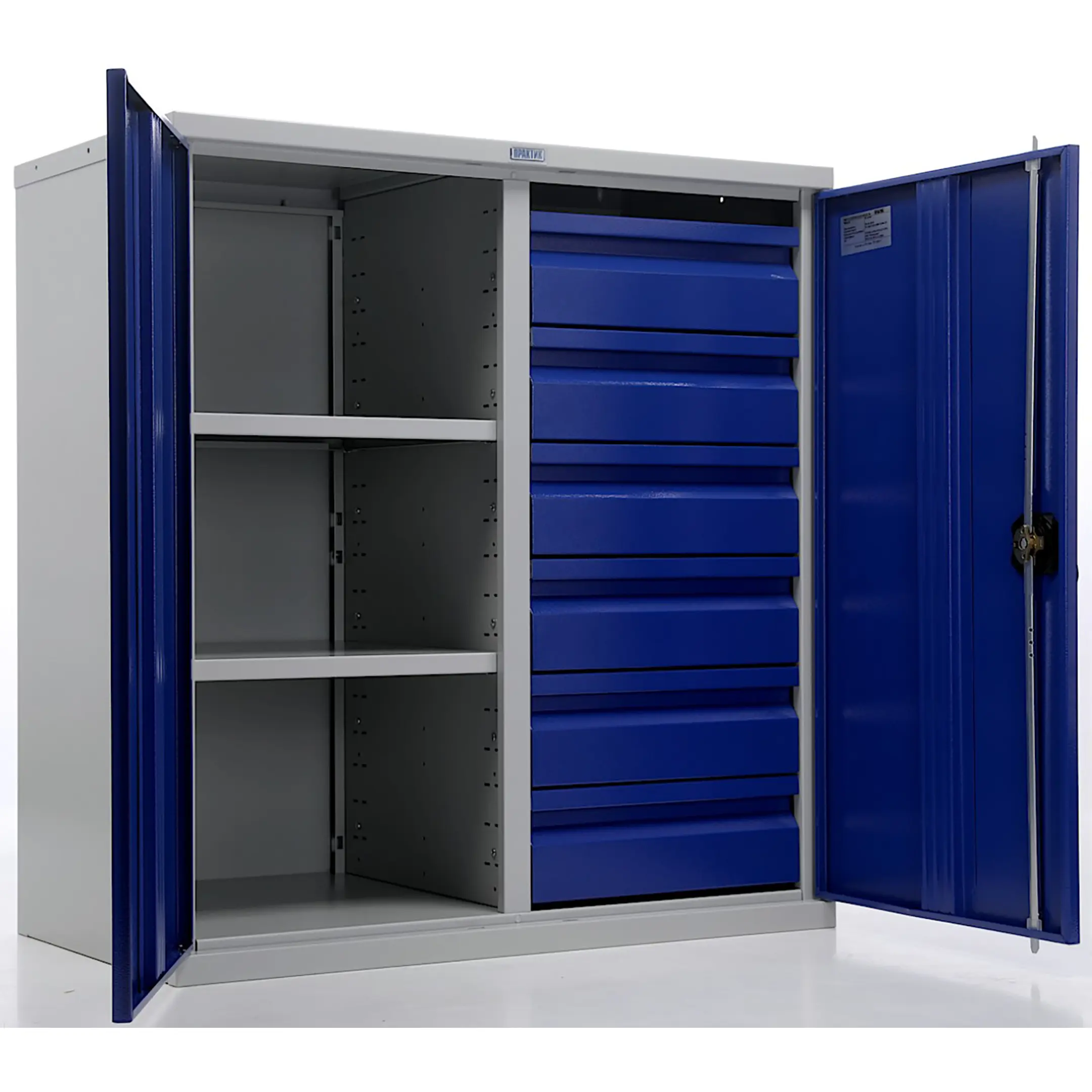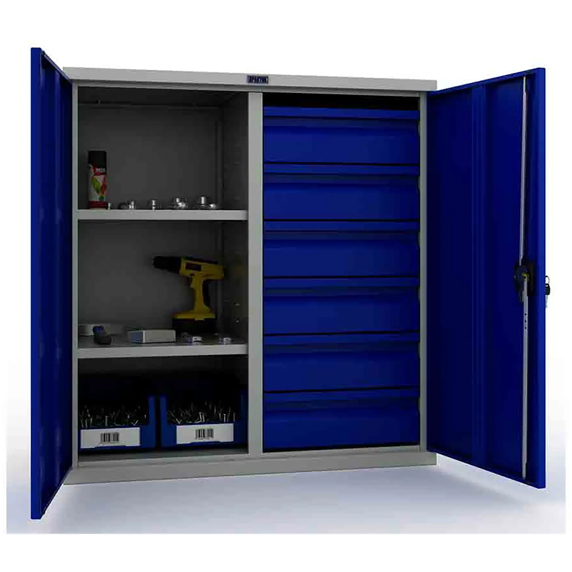 - Надежная защита содержимого — прочный стальной корпус и запирающиеся на замок двери обеспечивают защиту ценного инструмента от кражи, несанкционированного использования, а также от пыли и влаги в нерабочее время. Замок гарантирует базовый уровень безопасности.