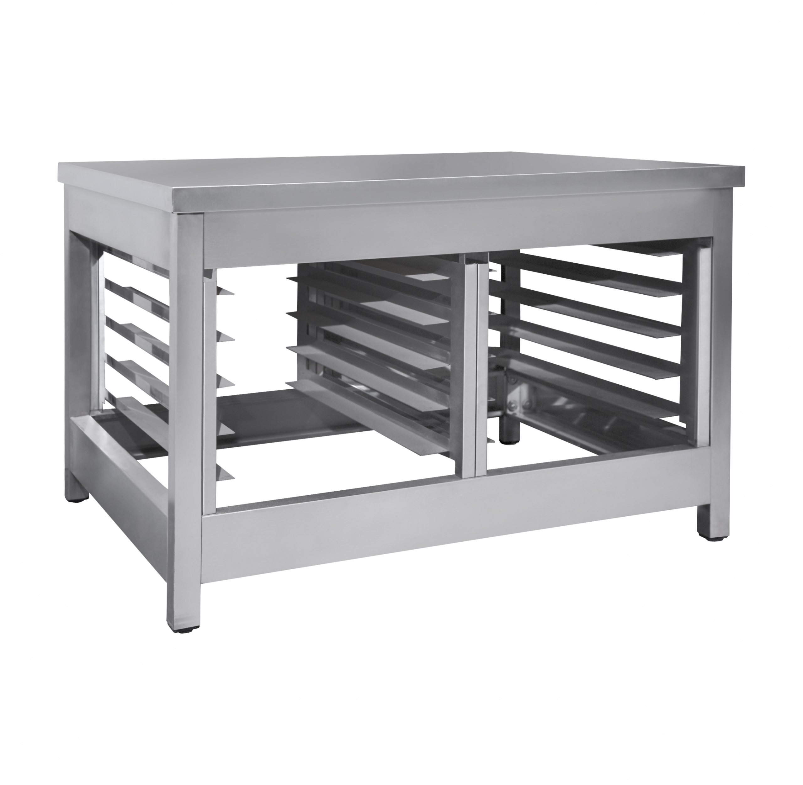 Держатели снизу используют для размещения противней и пекарских листов. Ножки регулируются по высоте для компенсации неровностей пола.