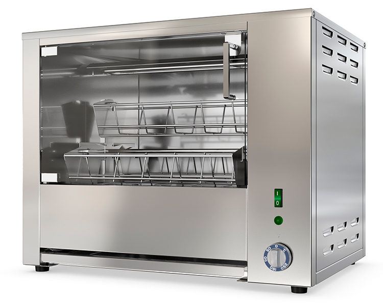 - Карусельная конструкция — 8 кур помещаются в 4 садка, которые приводятся в движение электромотором, обеспечивая равномерное вращение и отличную прожарку.