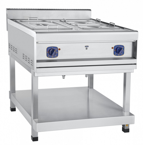 Две ванны для воды. Терморегулятор позволяет поддерживать температуру воды от +30 С до +85 С. Гастроемкости с горячей опцией устанавливаются в гнездо ванны. Слив воды осуществляется с помощью сливного крана. Подставка из нержавеющей стали.