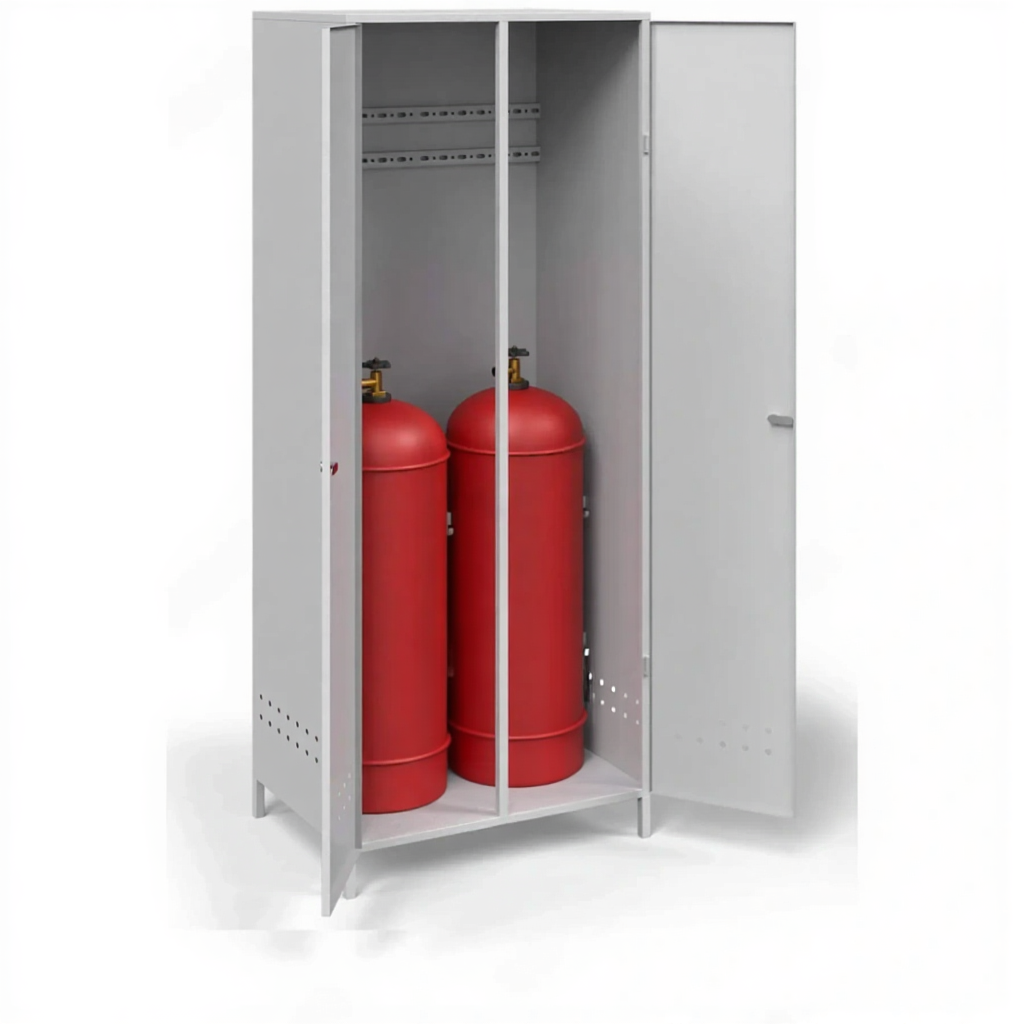 - Удобство для эксплуатации и эргономика — несмотря на массивность, конструкция продумана для удобства: широкая дверца обеспечивает легкий доступ для установки, замены баллонов и обслуживания оборудования. Шкаф рассчитан на надежное настенное или стационарное напольное крепление.