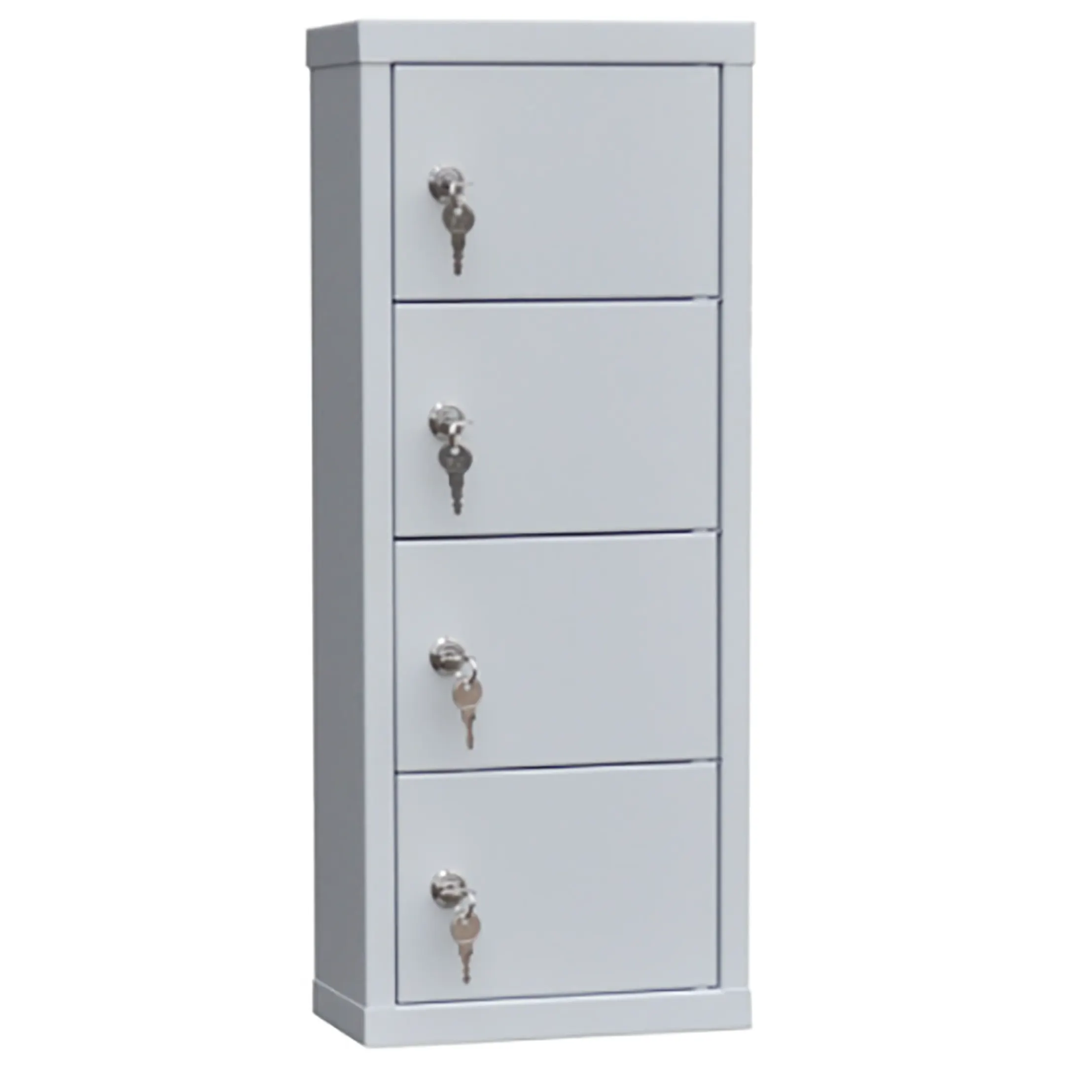 - Минимальные габариты для максимальной экономии пространства — шкаф занимает крайне мало места, предоставляя при этом 4 индивидуальные запирающиеся ячейки. Его можно разместить на любом свободном углу стола, полке, прилавке или в сейфе, не нарушая эргономику рабочего места.