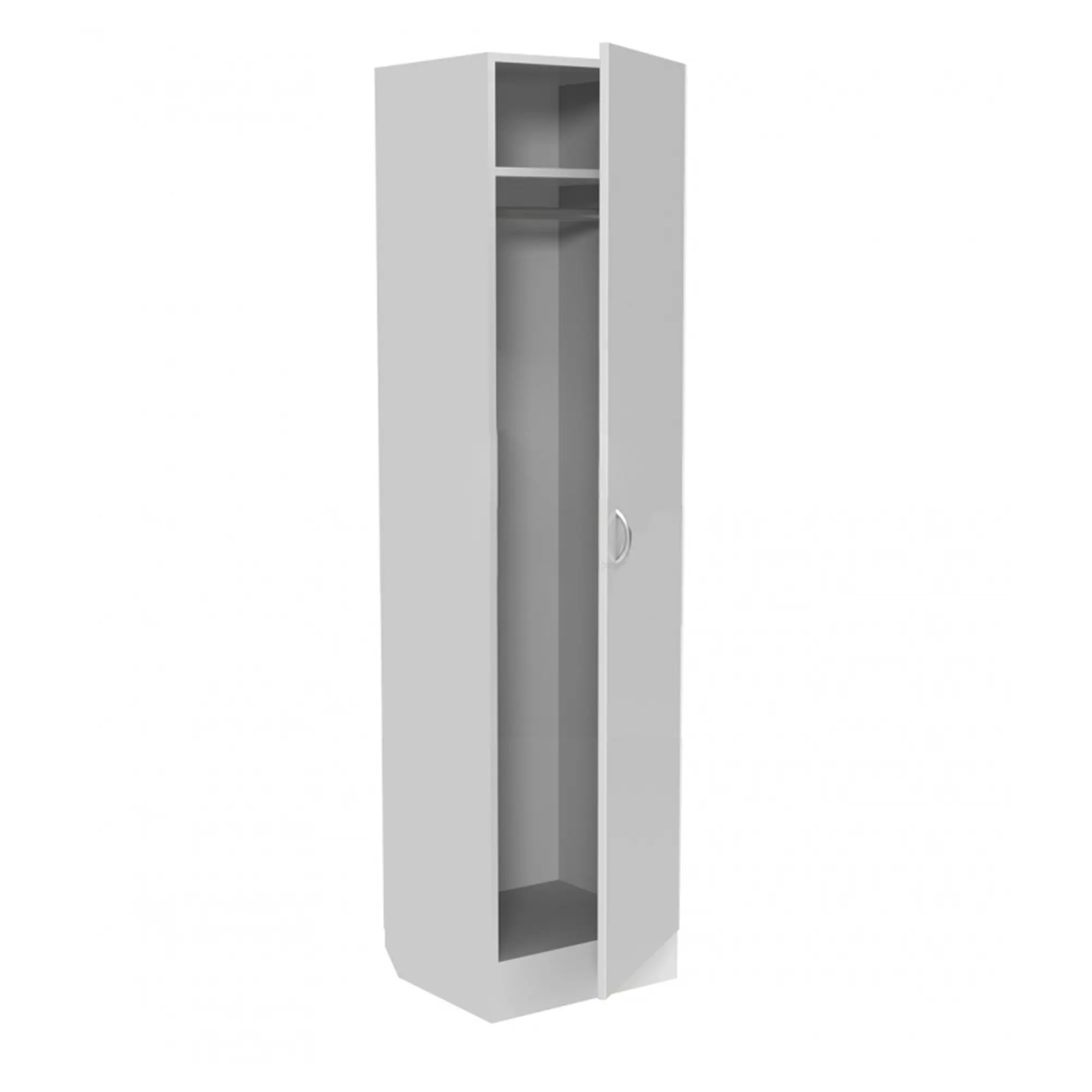 • конструкция одностворчатая с одной дверью, полкой для головных уборов и перекладиной для вешалок;