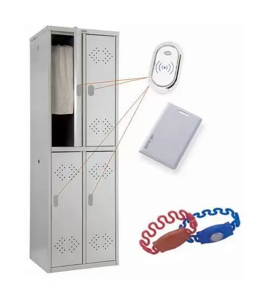 - влагозащищенные и термостойкие электронные ключи в виде резиновых растягивающихся браслетов используются для открывания и закрывания замка, а также возможно применение бесконтактных пластиковых Proximity Card HID вместо браслетов;