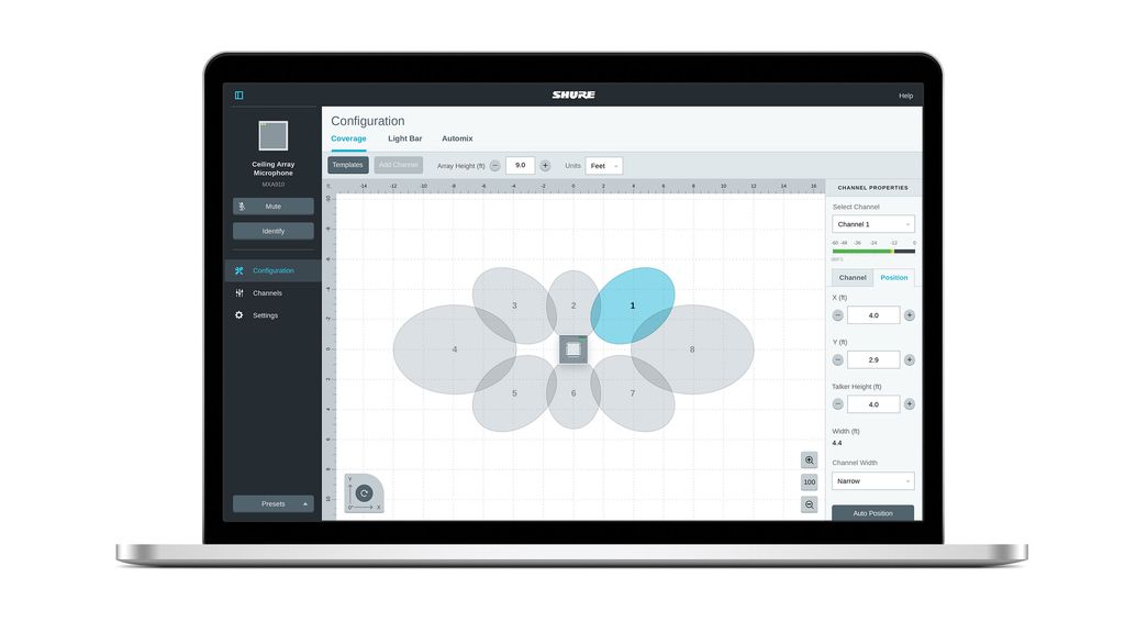 Потолочные Микрофонные Массивы Microflex® Advance™ управляются при помощи программного обеспечения Shure IntelliMix® DSP Suite для точных настроек покрытия, автоматического микширования, коррекции частотности и снижения эхо-эффекта.