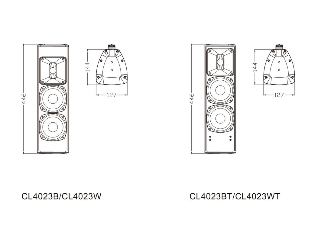 Серия CL4023 представляет собой акустическую систему колонного типа с различными цветами и функциями. Продукт соответствует стандарту IP56. Звук мягкий и сбалансированный. Корпус изготовлен из алюминиевого сплава. Буквы B и W после модели обозначают черный и белый цвет соответственно, а буква T представляет собой конфигурацию с трансформатором.